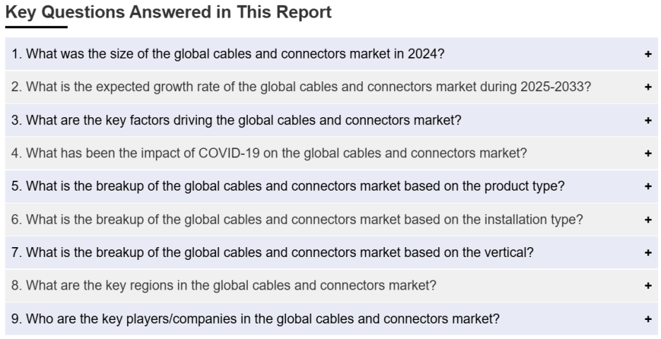 IMARC Group은 2025-2033년 글로벌, 지역 및 국가 수준의 예측과 함께 글로벌 케이블/커넥터 시장 보고서의 각 부문의 주요 동향에 대한 분석을 제공합니다. 이 보고서는 제품 유형, 설치 유형 및 업종에 따라 시장을 분류했습니다.